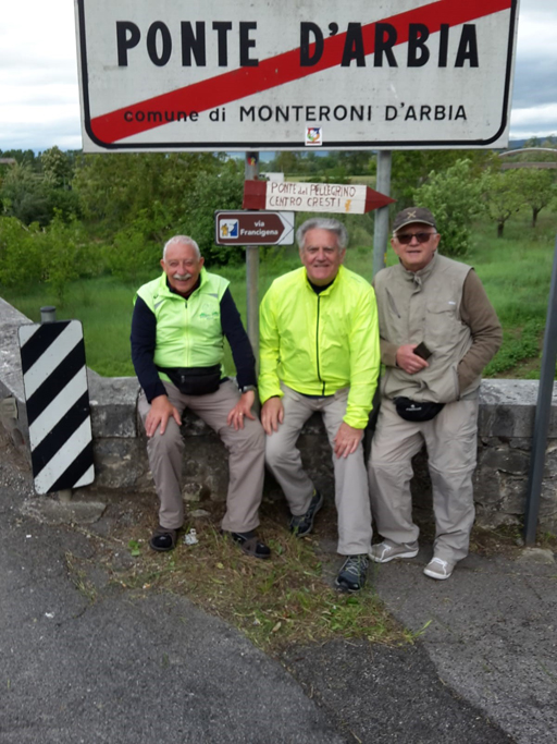 1° GIORNO- Lunedì 13/05/2019 Trasferimento da MODENA a SIENA Partiti in treno da Modena con la pioggia alle ore 07.41, cambiamo a Firenze SM Novella, con arrivo a Siena ore 10.40 senza pioggia e col cielo tendente al sereno. Dalla Stazione, con una serie di scale mobili ci portiamo al piazzale alto della stazione ferroviaria ed a piedi andiamo all' hotel Minerva di via Garibaldi dove, come da accordi con Bags Free, lasciamo i nostri bagagli che ritroveremo questa sera al B&B di Ponte D'Arbia. Raggiungiamo il punto di partenza del bus S2 che ci porta a Isola D' Arbia, evitando i circa 8/9 Km. di strada asfaltata della periferia industriale della citta. Durante il percorso in autobus parliamo con un simpatico toscano (ha fatto il militare a Modena all' VIII Campale) che ci dà le giuste indicazioni per rintracciare il punto di partenza del nostro cammino.
